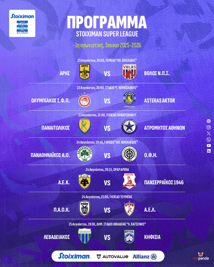 Ο Παναθηναϊκός παίζει με τον ΟΦΗ εντός έδρας την Κυριακή 24/08 στις 19:45. Η ΑΕΚ ξεκινάει κι εκείνη με εντός, αφού αντιμετωπίζει στην «OPAP Arena» τον Πανσερραϊκό (24/08-20:15). Τέλος ΠΑΟΚ και Άρης κοντράρονται με ΑΕΛ (24/08-21:00) και Βόλο (23/08-20:00) αντίστοιχα εντός έδρας.