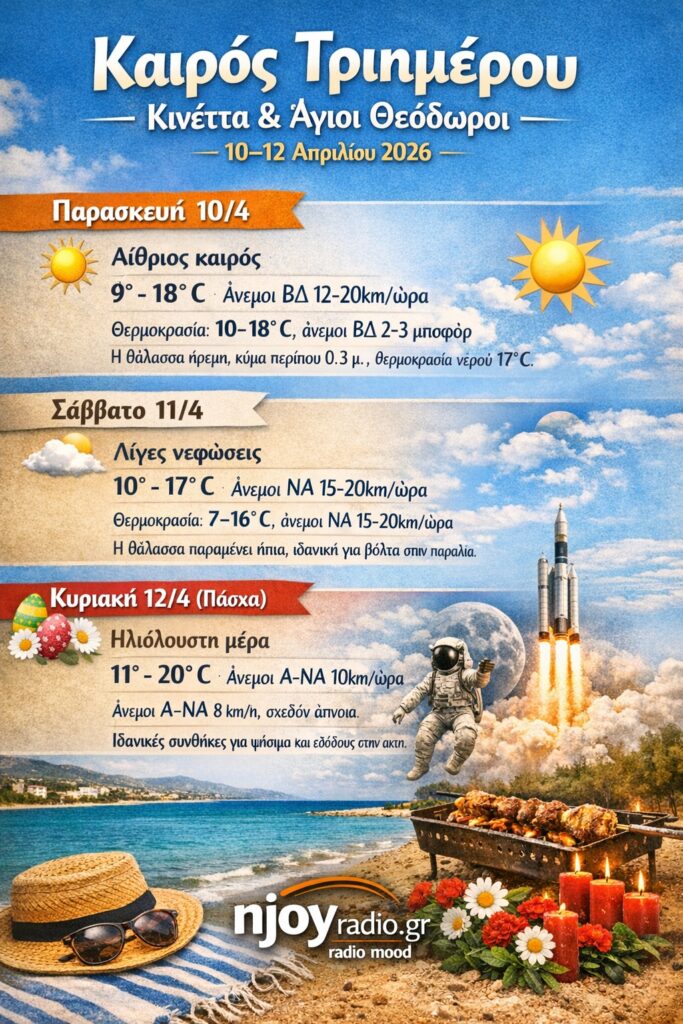 🌤 Καιρός τριημέρου για Κινέττα & Αγίους Θεοδώρους (10–12 Απριλίου 2026)