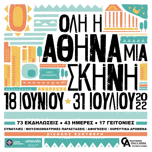 *Το πρόγραμμα «Όλη η Αθήνα μια Σκηνή» πραγματοποιείται στο πλαίσιο του Culture is Athens / Ο πολιτισμός είναι η Αθήνα, του τριετούς σχεδίου που έχει ανακοινώσει ο Δήμος και οι φορείς του, το οποίο στοχεύει στην αναβάθμιση, την ανάδειξη και την ενοποίηση του πολιτιστικού ιστού της Αθήνας αλλά και την έμπρακτη στήριξη των καλλιτεχνών και των εργαζόμενων στον κλάδο του πολιτισμού.